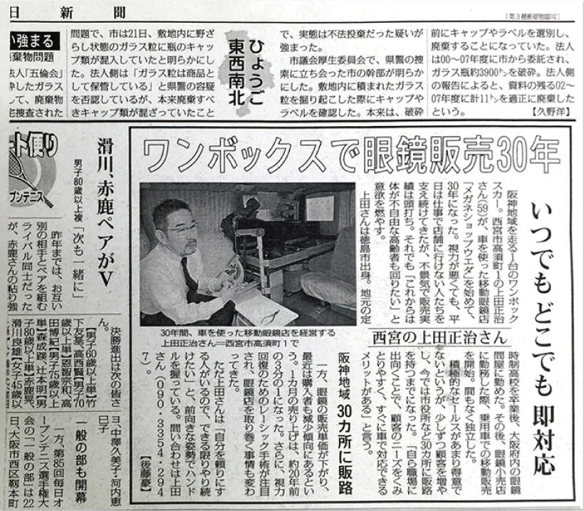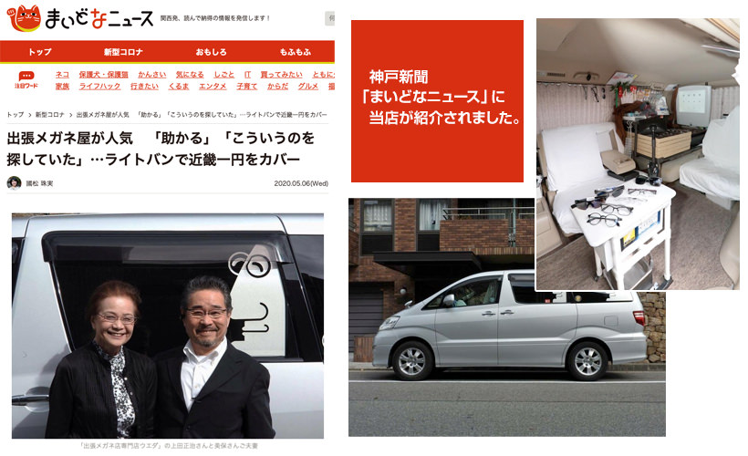 メガネショップウエダのウェブサイトへアクセス下さり、ありがとうございます。私たちは関西地域の役所・会社(お勤め先)ー般住宅、介護施設に車でお伺いする「出張メガネ専門店」です。眼鏡一筋、車での出張販売も40年を超え、経験豊富な店主が、視力測定からレンズ、フレーム選びまで、お客様お一人お一人のニーズをじっくりお聞きし、生活用途に最適なメガネをご提案・販売させて頂き、出来上がったメガネを後日改めてお届け、フィッティング(見え方の調整)、その後のアフターケアをさせて頂きます。